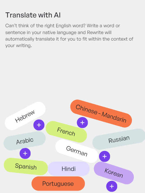 Yes. Wordtune’s AI-assisted translation can help you rewrite your text in English from any of these 10 languages: Chinese – Mandarin, Arabic, Hebrew, Korean, Hindi, Russian, Spanish, German, French, Portuguese. Simply click Rewrite and Wordtune will translate your text into English.